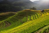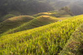 Rolnik w Mu cang chai wsi chodzenie po górach i tarasach złotego ryżu w mieście Mucangchai w pobliżu miasta Sapa, na północ od Wietnamu