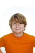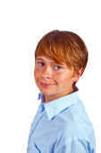 portret szczęśliwy chłopiec z niebieską koszulę w studio