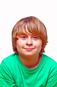 portret szczęśliwy chłopiec z niebieską koszulę w studio