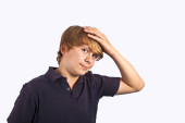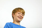 portret szczęśliwy chłopiec z niebieską koszulę w studio