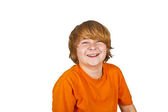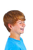 portret szczęśliwy chłopiec z niebieską koszulę w studio