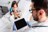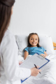 Widok z boku pediatra patrząc na schowek w pobliżu dziewczyny na łóżku szpitalnym