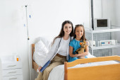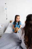 Zdjęcie "Widok z boku pediatra patrząc na schowek w pobliżu dziewczyny na łóżku szpitalnym " może być wykorzystywane do celów osobistych i komercyjnych zgodnie z warunkami zakupionej licencji Royalty-free. Obraz jest dostępny do pobrania w jakości wysokiej rozdzielczości do 5760x3840.