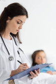 Pediatra trzymający maskę tlenową i patrzący na pacjenta w klinice