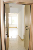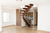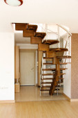 brązowe drewniane schody we wnętrzu dwupoziomowego mieszkania