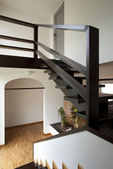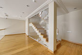 brązowe drewniane schody we wnętrzu dwupoziomowego mieszkania