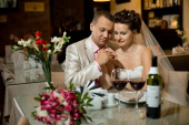 Zdjęcie "pana młodego i panny młodej w kawiarni" może być wykorzystywane do celów osobistych i komercyjnych zgodnie z warunkami zakupionej licencji Royalty-free. Obraz jest dostępny do pobrania w jakości wysokiej rozdzielczości do 5760x3840.