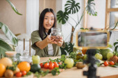 Selektywna koncentracja na twarzy młodej azjatyckiej blogerki lub twórczyni treści przygotowującej zdrową sałatkę i nagrywającej wideo przez telefon. Atrakcyjny kobieta gospodarstwa orzechy laskowe podczas nagrywania bloga z telefonu