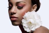 Afrykańska amerykanka z kwiatami we włosach patrząca na kamerę w pobliżu Cyganki odizolowana na szarym, sztandarze