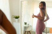 Zdjęcie "Pomyślna koncepcja odchudzania. Szczęśliwa szczupła afrykańska kobieta w sportowej odzieży patrząc na jej odbicie w lustrze i uśmiechnięta, zadowolona z odchudzania" może być wykorzystywane do celów osobistych i komercyjnych zgodnie z warunkami zakupionej licencji Royalty-free. Obraz jest dostępny do pobrania w jakości wysokiej rozdzielczości do 5760x3840.
