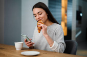 Zdjęcie "Cieszy czarna młoda kobieta w casual jeść croissant, wpisując na telefon, rozmowy, czytanie wiadomości i cieszyć się śniadaniem, dzień dobry w nowoczesnym wnętrzu kuchni. Nowa aplikacja social media, surfing w internecie w domu" może być wykorzystywane do celów osobistych i komercyjnych zgodnie z warunkami zakupionej licencji Royalty-free. Obraz jest dostępny do pobrania w jakości wysokiej rozdzielczości do 5760x3840.