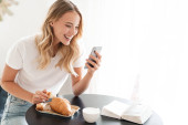 Cieszy czarna młoda kobieta w casual jeść croissant, wpisując na telefon, rozmowy, czytanie wiadomości i cieszyć się śniadaniem, dzień dobry w nowoczesnym wnętrzu kuchni. Nowa aplikacja social media, surfing w internecie w domu