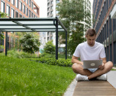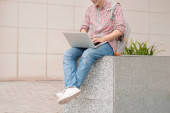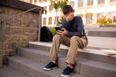 Zdjęcie "Skoncentrowany nastolatek siedzący na zewnątrz, podsłuchujący dotyk na laptopie podczas rozmowy telefonicznej." może być wykorzystywane do celów osobistych i komercyjnych zgodnie z warunkami zakupionej licencji Royalty-free. Obraz jest dostępny do pobrania w jakości wysokiej rozdzielczości do 5760x3840.