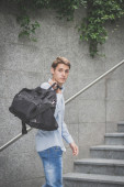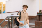 Uśmiechnięty nastolatek z plecakiem na ramieniu i podręcznikiem w ręku stojącym na schodach