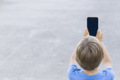 Uśmiechnięty, ciemnowłosy nastolatek siedzący na betonowej poręczy trzymający przed sobą komórkę.