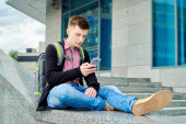 sfrustrowany nastolatek siedzi na schodach betonowych na zewnątrz i gapi się na ekran dotykowy telefonu komórkowego