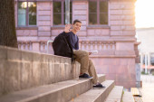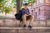 Zdjęcie "Zdenerwowany chłopak ze smartfonem siedzącym na betonowych schodach na zewnątrz i chowającym twarz w dłoni" może być wykorzystywane do celów osobistych i komercyjnych zgodnie z warunkami zakupionej licencji Royalty-free. Obraz jest dostępny do pobrania w jakości wysokiej rozdzielczości do 5760x3840.