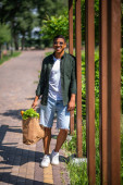 Radosny uroczy nastolatek z książką i torbą szkolną w rękach schodzących po betonowych schodach