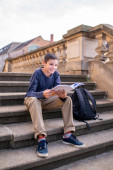 Portret w pasie zaskoczonego nastolatka z otwartym podręcznikiem w rękach patrzącego w oddali