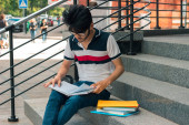 Uśmiechnięty nastolatek siedzący z otwartym podręcznikiem w rękach na betonowych schodach