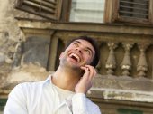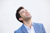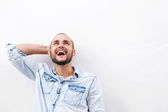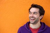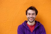 Portret twarz młodego człowieka, śmiejąc się z bliska