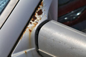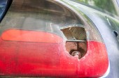 Samochód z porysowaną farbą i wgniecionymi częściami na boku. Wynik niewielkiego wypadku - stłuczka.
