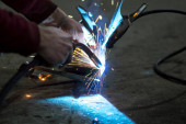 spawacz w ciemności wykonuje prace spawalnicze na metalu z maszyny spawalniczej