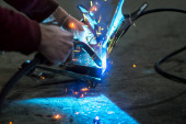 spawacz w ciemności wykonuje prace spawalnicze na metalu z maszyny spawalniczej