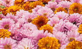Zbliżenie zdjęcie gromadki ciemnoróżowych chryzantemy z żółtymi centrami i białymi końcówkami na płatkach. Wzór chryzantemy w parku kwiatów. Gromada różowych kwiatów chryzantemy fioletowej.