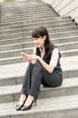 Zdjęcie "Kobieta siedzi przy użyciu smartphone." może być wykorzystywane do celów osobistych i komercyjnych zgodnie z warunkami zakupionej licencji Royalty-free. Obraz jest dostępny do pobrania w jakości wysokiej rozdzielczości do 5760x3840.
