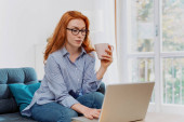 Zdjęcie "Miła piękna pani pracy w notebooku usiąść na kanapie w domu - sprawdź na oline sklepy dla sprzedaży cyberponiedziałek - technologia kobieta koncepcja alternatywnego biura freelance" może być wykorzystywane do celów osobistych i komercyjnych zgodnie z warunkami zakupionej licencji Royalty-free. Obraz jest dostępny do pobrania w jakości wysokiej rozdzielczości do 5760x3840.