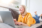 Zdjęcie "Positive young woman freelancer watching video in blog on netbook at comfortable home. Beautiful young business woman working on laptop.Freelancer connecting to internet" może być wykorzystywane do celów osobistych i komercyjnych zgodnie z warunkami zakupionej licencji Royalty-free. Obraz jest dostępny do pobrania w jakości wysokiej rozdzielczości do 5760x3840.