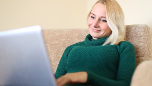 Positive young woman freelancer watching video in blog on netbook at comfortable home. Beautiful young business woman working on laptop.Freelancer connecting to internet