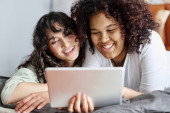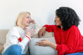 Zdjęcie "Dwie piękne kobiety korzystające z laptopa do rozmowy wideo online i toasting online z przyjaciółmi. Online party dla przyjaciół." może być wykorzystywane do celów osobistych i komercyjnych zgodnie z warunkami zakupionej licencji Royalty-free. Obraz jest dostępny do pobrania w jakości wysokiej rozdzielczości do 5760x3840.