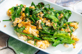 Zdjęcie "Zdrowa sałatka z zielonego dzikiego poru, gotowane jajko i ogórek, zbliżenie. Dzika sałatka czosnkowa z jajkami gotowanymi." może być wykorzystywane do celów osobistych i komercyjnych zgodnie z warunkami zakupionej licencji Royalty-free. Obraz jest dostępny do pobrania w jakości wysokiej rozdzielczości do 5760x3840.