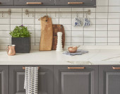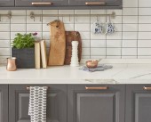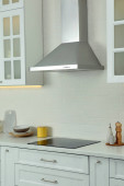 Eleganckie wnętrze kuchni z nowoczesnym okapem na płycie grzewczej i stylowymi meblami
