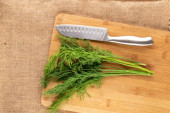 Świeże koper przygotowania do suszenia na drewnianym stole, płaskie układanki