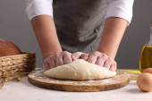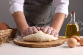 Kobieta ugniatająca ciasto przy drewnianym stole przy białej ceglanej ścianie, zbliżenie
