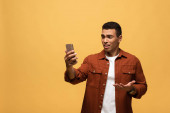 Zdjęcie "mężczyzna stojący w ciemnej kuchni ze smartfonem w podniesionej ręce i szukający połączenia podczas przerwy w dostawie prądu" może być wykorzystywane do celów osobistych i komercyjnych zgodnie z warunkami zakupionej licencji Royalty-free. Obraz jest dostępny do pobrania w jakości wysokiej rozdzielczości do 5760x3840.