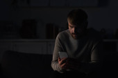 mężczyzna stojący w ciemnej kuchni ze smartfonem w podniesionej ręce i szukający połączenia podczas przerwy w dostawie prądu