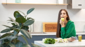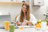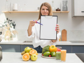 Zdjęcie "Atrakcyjna dziewczyna trzyma pusty tablet z białym prześcieradłem do tekstu, stojąc przy stole ze świeżymi owocami i warzywami. Koncepcja planu posiłków, wegetarianizm." może być wykorzystywane do celów osobistych i komercyjnych zgodnie z warunkami zakupionej licencji Royalty-free. Obraz jest dostępny do pobrania w jakości wysokiej rozdzielczości do 5760x3840.
