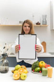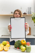 Atrakcyjna dziewczyna trzyma pusty tablet z białym prześcieradłem do tekstu, stojąc przy stole ze świeżymi owocami i warzywami. Koncepcja planu posiłków, wegetarianizm.