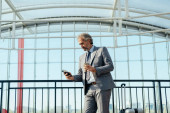 Uśmiechnięty Dojrzały Biznesmen Korzystanie z tabletu cyfrowego do rozmowy wideo na lotnisku