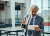 Zdjęcie "Uśmiechnięty Dojrzały Biznesmen Korzystanie z tabletu cyfrowego do rozmowy wideo na lotnisku" może być wykorzystywane do celów osobistych i komercyjnych zgodnie z warunkami zakupionej licencji Royalty-free. Obraz jest dostępny do pobrania w jakości wysokiej rozdzielczości do 5760x3840.