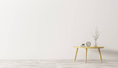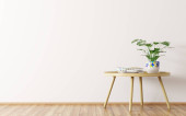 Wnętrze pokoju z białą ścianą. Wazon z liściem palmowym na dekoracyjnym stole akcentowym. Opróżniona ściana i marmurowa podłoga, wiszące światła. Nowoczesny wystrój domu. 3d renderowanie