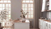 Zdjęcie "Czeska drewniana kuchnia w odcieniach niebieskiego i beżowego z wyspy i stolców. Podłoga parkietowa, półki i szafki. Gospodarstwo retro wystrój wnętrz" może być wykorzystywane do celów osobistych i komercyjnych zgodnie z warunkami zakupionej licencji Royalty-free. Obraz jest dostępny do pobrania w jakości wysokiej rozdzielczości do 5760x3840.