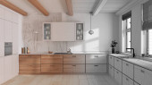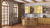 Zdjęcie "Dom rustykalny vintage drewniana kuchnia w odcieniach pomarańczowego i beżowego z wyspy i stolców. Podłoga parkietowa, półki i szafki. Kolonialny wystrój wnętrz" może być wykorzystywane do celów osobistych i komercyjnych zgodnie z warunkami zakupionej licencji Royalty-free. Obraz jest dostępny do pobrania w jakości wysokiej rozdzielczości do 5760x3840.