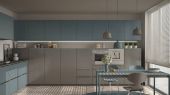 Zdjęcie "Minimalistyczna nowoczesna drewniana jadalnia i kuchnia w odcieniach niebieskich. Wyspa i stół z krzesłami, parkiet. Nowoczesny wystrój wnętrza" może być wykorzystywane do celów osobistych i komercyjnych zgodnie z warunkami zakupionej licencji Royalty-free. Obraz jest dostępny do pobrania w jakości wysokiej rozdzielczości do 5760x3840.