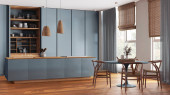 Minimalistyczna nowoczesna drewniana jadalnia i kuchnia w odcieniach niebieskich. Wyspa i stół z krzesłami, parkiet. Nowoczesny wystrój wnętrza