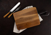 Koncepcja czasu posiłku ze sztućcami na desce do cięcia zbliżyć na białym tle